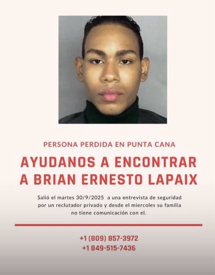 Punta Cana.– La familia de Brian Ernesto Lapaix solicita ayuda para localizarlo, luego de que fuera reportado como desaparecido desde el miércoles 1 de octubre de 2025.
