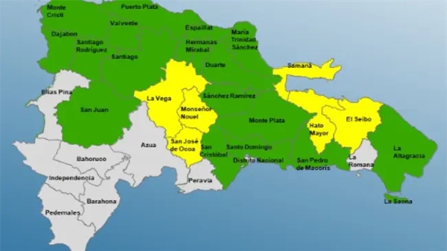 Santo Domingo.– El Centro de Operaciones de Emergencias (COE) informó que 6 provincias se mantienen en alerta amarilla y 18 en alerta verde, ante el riesgo de inundaciones repentinas en zonas urbanas y rurales, así como crecidas de ríos, arroyos y cañadas, además de posibles deslizamientos de tierra.